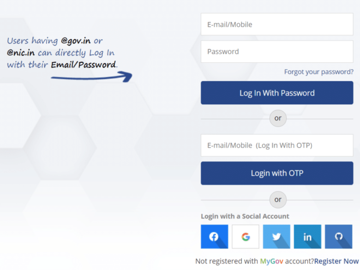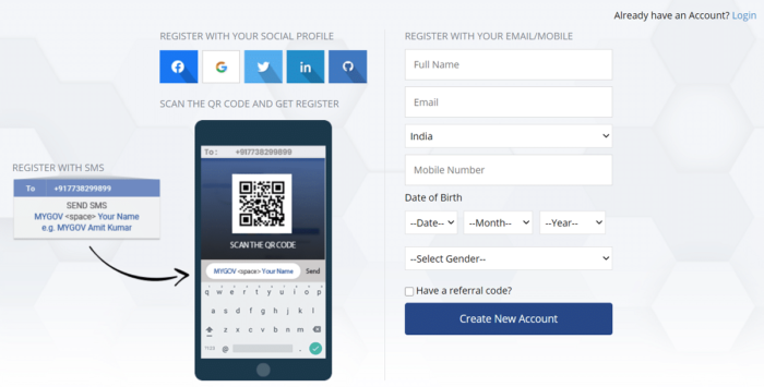 चरण 3: यहां उम्मीदवार अपना नाम, ई-मेल आईडी, मोबाइल नंबर, जन्म तिथि दर्ज कर सकते हैं, लिंग का चयन कर सकते हैं और फिर “नया खाता बनाएं” टैब पर क्लिक कर सकते हैं। उम्मीदवार अपने सोशल प्रोफाइल जैसे फेसबुक, गूगल, ट्विटर, लिंक्डइन पर अकाउंट के माध्यम से भी पंजीकरण कर सकते हैं। इसके अलावा, उम्मीदवार MYGOV<स्पेस>आपका नाम जैसे- MYGOV अमित कुमार +917738299899 पर एसएमएस भी भेज सकते हैं।