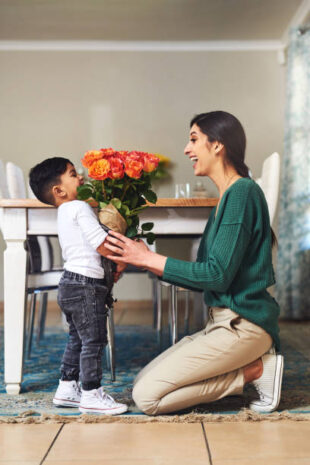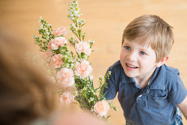 Shot of a little boy giving his mother a bouquet of flowers at home