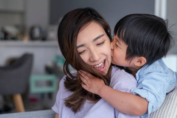 Close up shot of an adorable preschool age boy of Asian descent embracing his mom and giving her a kiss on the cheek. The loving mom is smiling with appreciation and affection. The family is spending quality time together at home.
