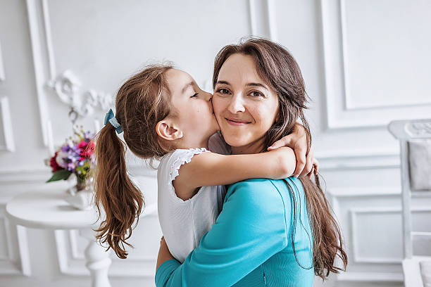 little girl about 10 years old embracing and kissing her smiling beautiful mother both looking at camera, happy family
