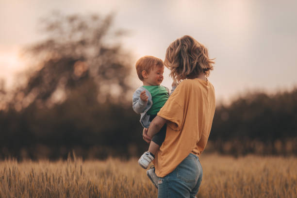 Photo of young mother and her baby boy spending time together outdoors in nature