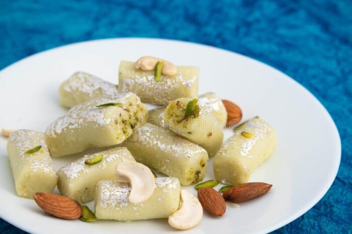 इस स्पेशल मिठाई को बनाने के लिए दो कप गरम पानी लेकर पिस्ते को पांच मिनट तक भिगो कर रखें। उसके बाद उसे दरदरा पीसकर अलग रख लें। नॉन स्टिक पैन में खोए को 10 मिनट तक पकाकर ठंडा होने के लिए रख दें। इसके बाद उसमें काजू पाउडर और चीनी डालकर आटे की तरह के गूंथ लें। इसके बाद पिस्ते और काजू के मिश्रण को 5 इंच तक लंबा सिलेंडर आकार दें। अब इस मिश्रण को काजू के चौकोर के टुकड़े के किनारे पर रख कर दोनों को साथ में रोल कर लें। बचे हुए काजू का मिश्रण और पिस्ता के मिश्रण को रोल कर लें। अब इन सब मिठाईयों पर चांदी का वर्क लपेटकर छोटे-छोटे टुकड़े काटकर परोसें।